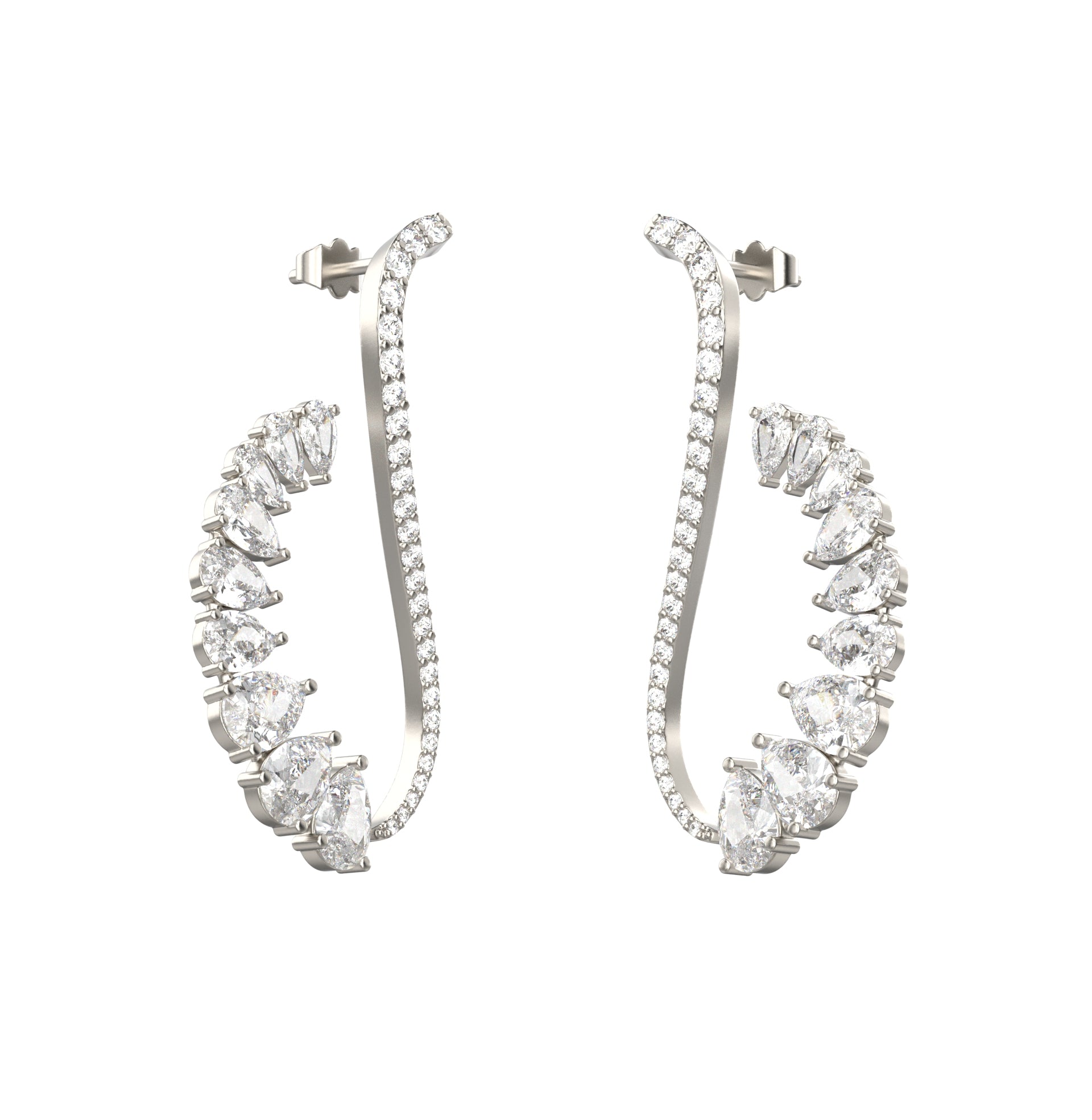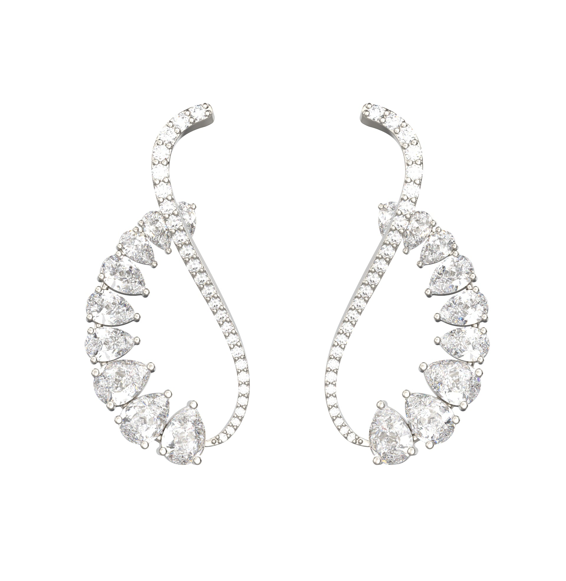 A statement earring as alluring as it is original. The remarkable design is defined by a sinuous curve of graduating round diamonds punctuated by sparkling pear-shaped diamonds. These earrings add a striking look for any special occasion.