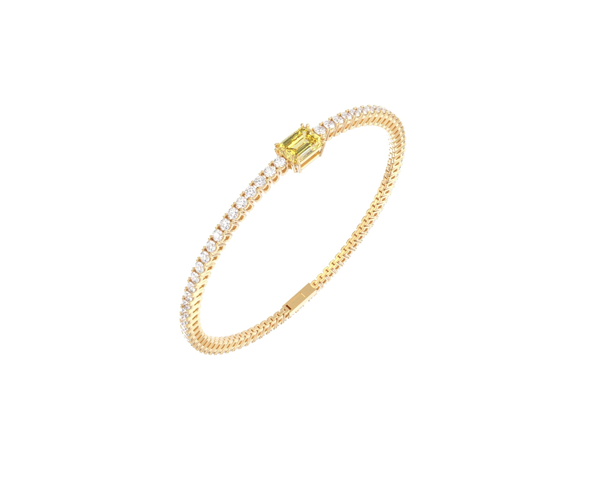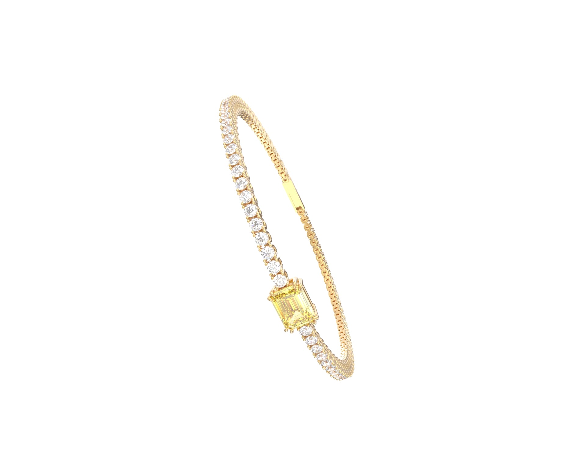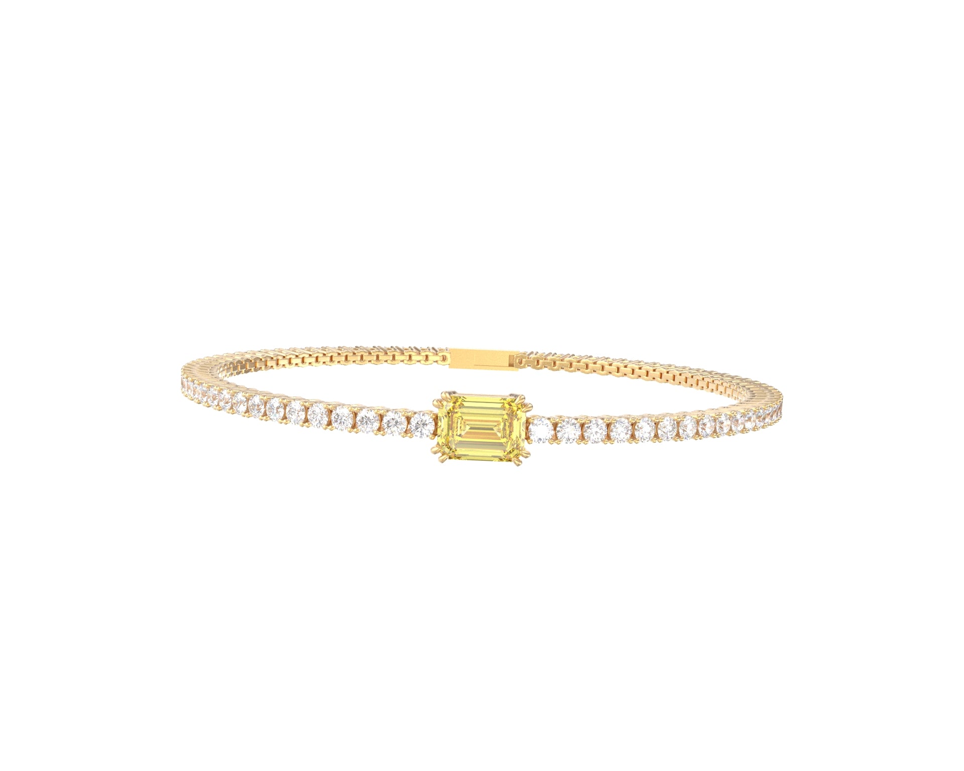 Make a statement wearing this classic tennis bracelet featuring a seamless line round diamonds punctuated by a captivating yellow emerald diamond. The timeless design reflects light with movement, creating an alluring display of brilliance and elegance.