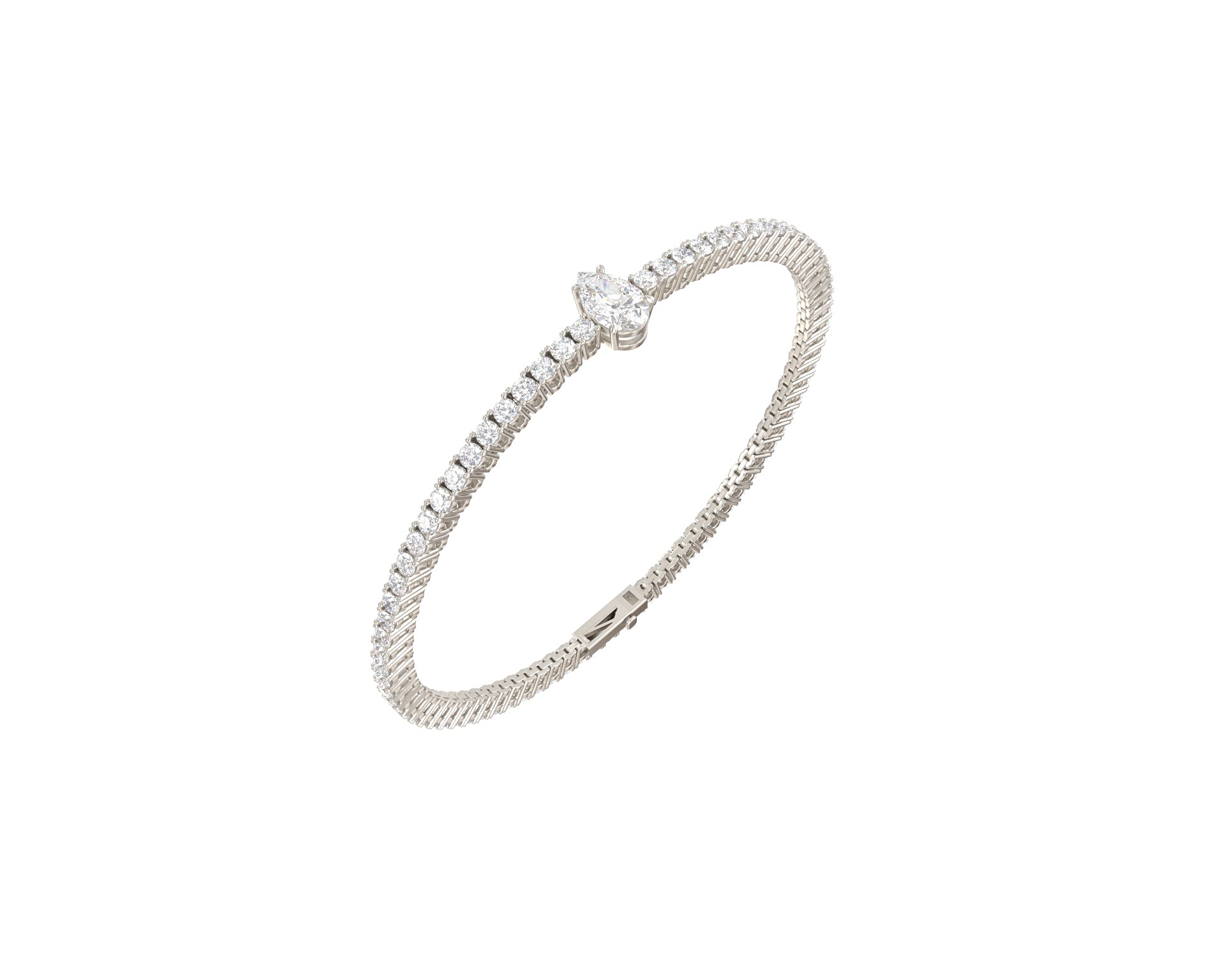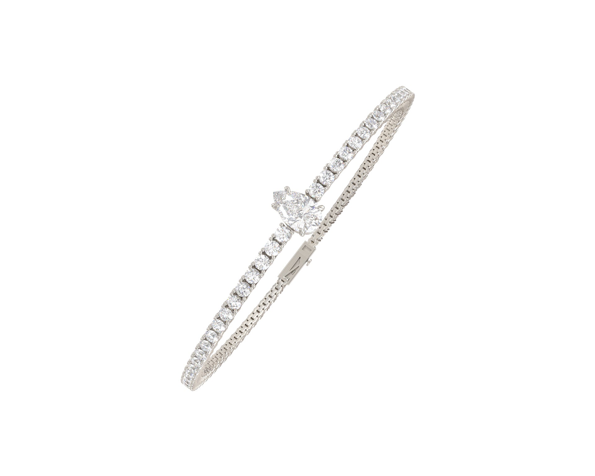 A graceful take on the classic tennis bracelet showcasing a seamless line of round diamonds accentuated by a sparkling pear-shaped diamond. Subtle yet alluring, the design reflects light with the slightest turn of the wrist.
