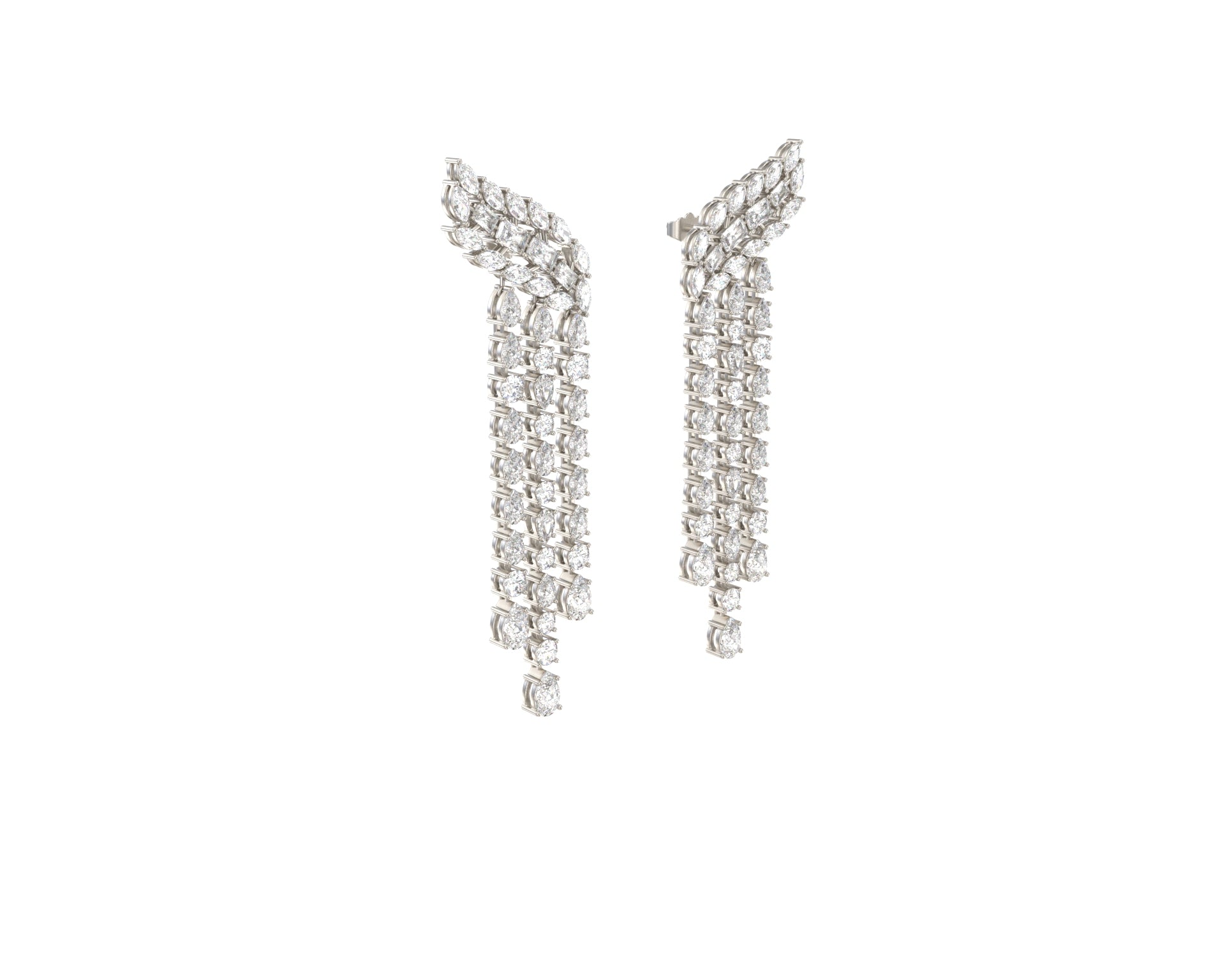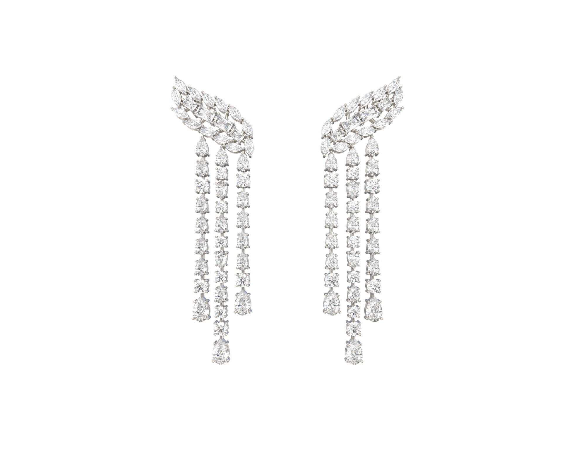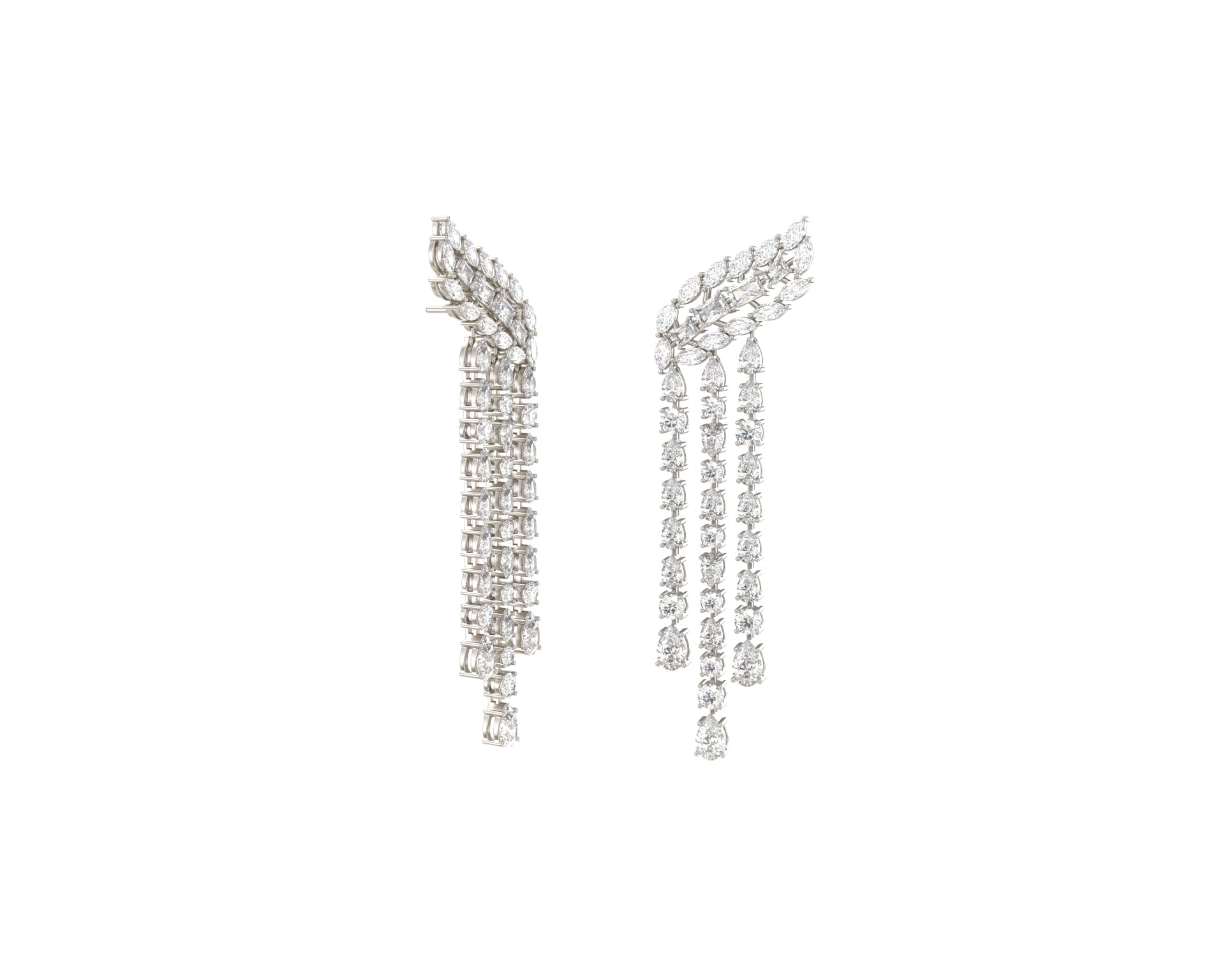 A luxurious interpretation of the climber design, these statement earrings enchant with striking proportion. From a brilliant arrangement of baguette and marquis diamonds hangs a linear trio of round and pear-shaped diamonds, emulating dew drops falling off a leaf at sunrise. The stunning design commands attention from every angle and features a dramatic sway to capture light with each step.