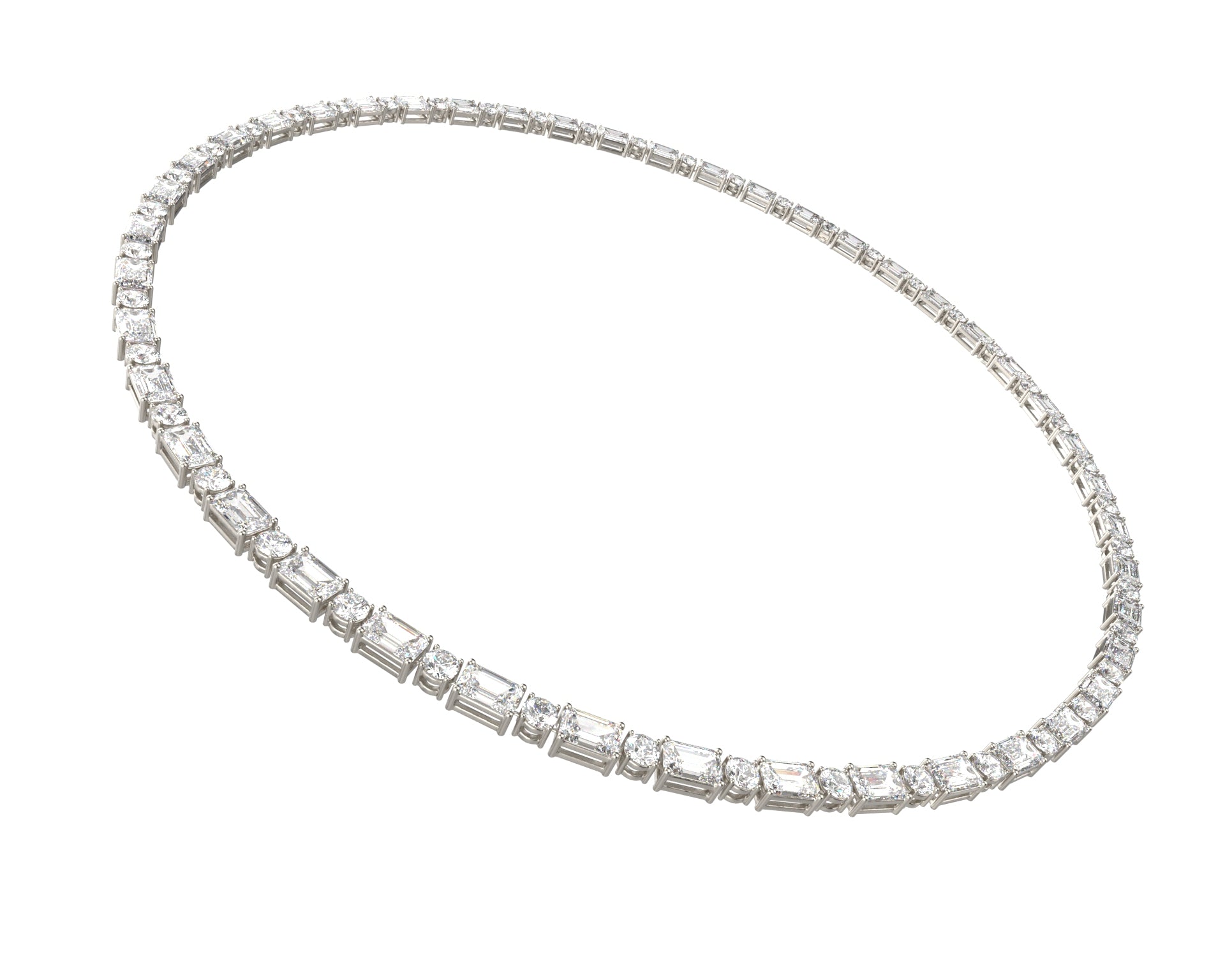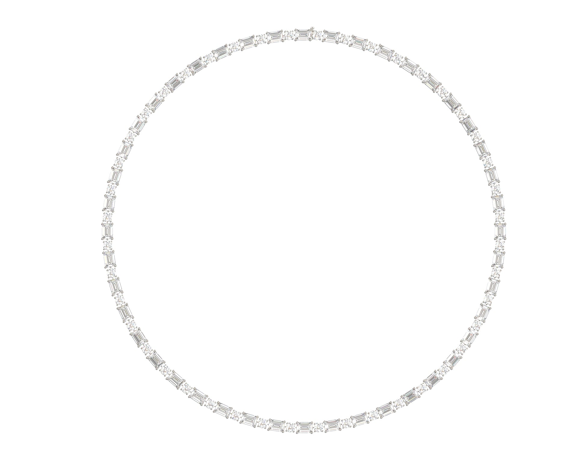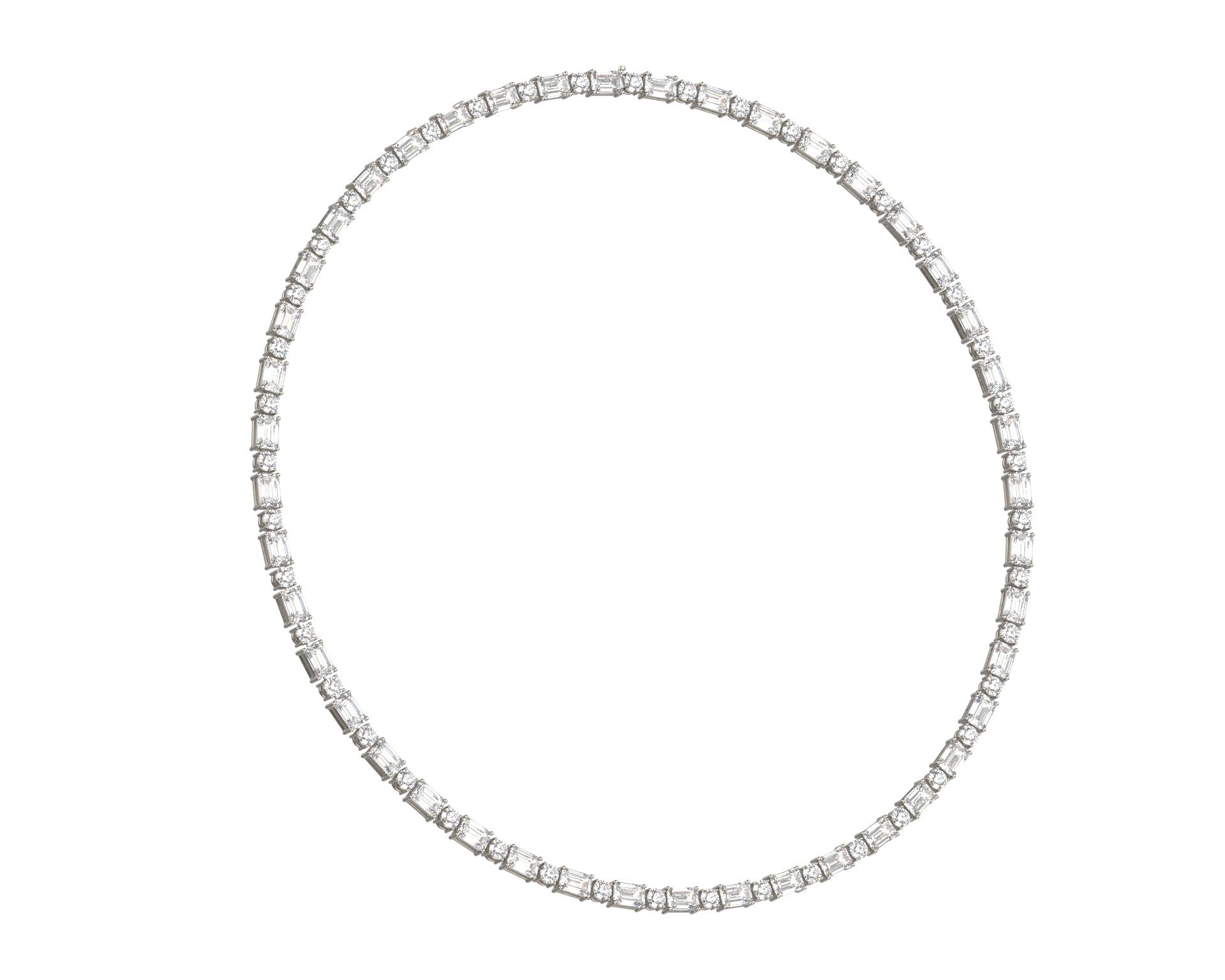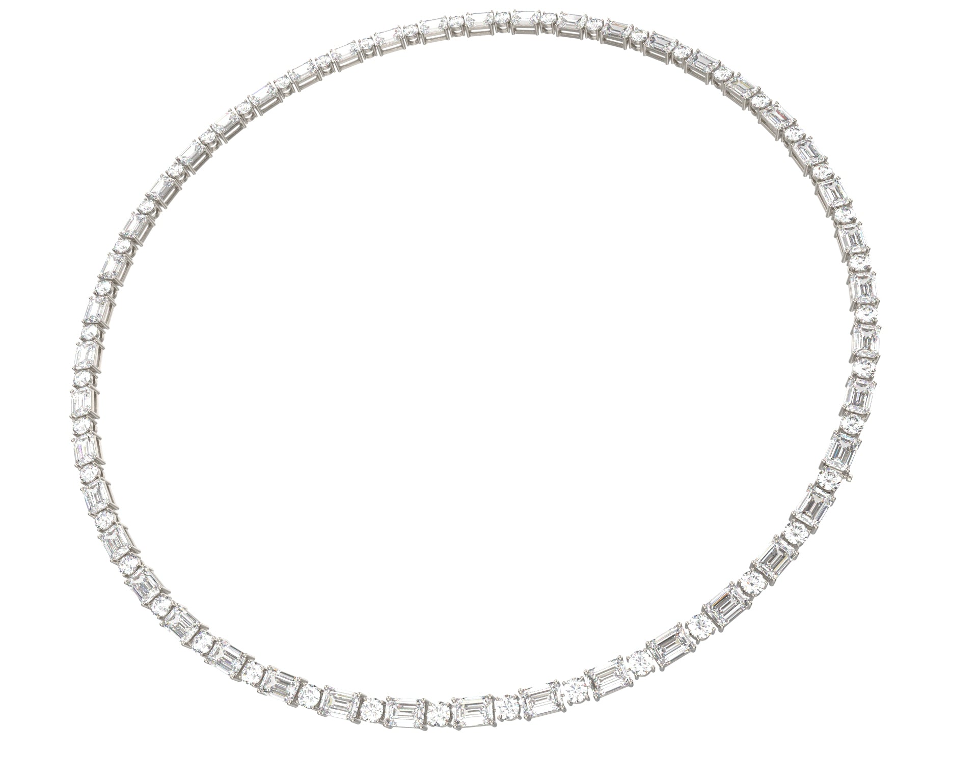 A modern interpretation of the classic tennis necklace pairing round and emerald cut diamonds. The design lies elegantly along the neckline, creating a timeless to mark your special occasion and beyond.